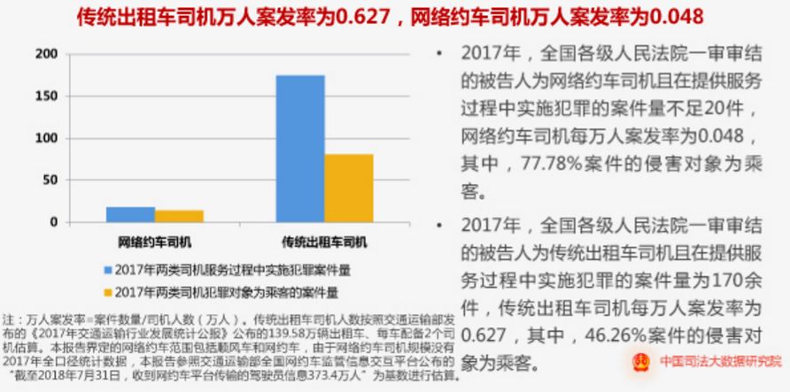 根据2018年9月21日最高法院发布的《司法大数据专题报告之网络约车与传统出租车服务过程中犯罪情况 》显示,传统出租车万人案发率为0.627,而网络约车司机万人案发率为0.048,也就是说,网约车的案发率是传统出租车1/13。