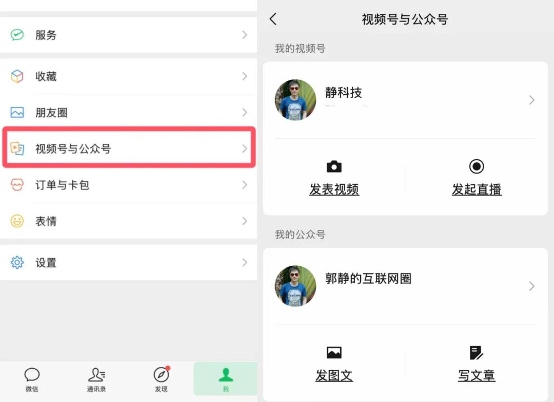 据郭静的互联网圈观察,日前,微信在其新版本中正灰度测试,公众号和视频号创作入口合并。用户将微信更新到新版本后,依次点击“我”→视频号与公众号→“我的公众号”,即可直接在自己的公众号上发图文或发文章。微信iOS最新版是8.0.64,直接在App Store中即可更新。安卓版,依次点击“我”→设置→关于微信→检查新版本,再更新即可。注意:用户要本身已经开通了视频号和公众号才会出现“视频号与公众号”按钮。